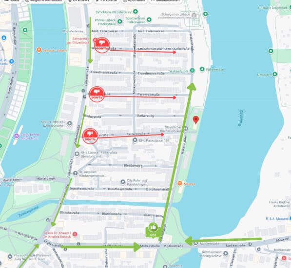 Bitte nutzt zur Zufahrt ausschließlich die Straßen Moltkestraße und Wakenitzufer. Andere Straßen wie die Attendorn-, Perceval- und Pelzerstr. sind zu schnal für Bootsanhänger und jeder beschädigte Außenspiegel ist für euch ärgerlich und erzeugt einen Anwohner, der die Regatta ablehnt. Bei der Abreise fahrt bitte den gleichen Weg zurück.